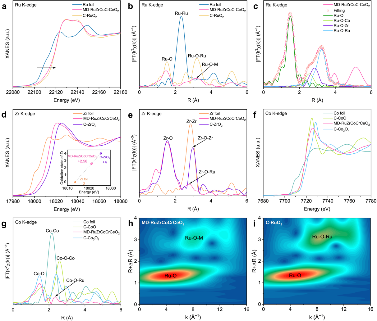 图2. MD-RuZrCoCrCeO2及参比样的电子性质和配位结构。a) 归一化Ru K边XANES谱图。b) Ru K边FT-EXAFS谱图。c) MD-RuZrCoCrCeO2的Ru K边R空间EXAFS拟合曲线。d) 归一化Zr K边XANES谱图。(d)中插图显示了由Zr K边XANES获得的Zr物种氧化态。e) Zr K边FT-EXAFS谱图。f) 归一化Co K边XANES谱图。g) Co K边FT-EXAFS谱图。h,i) MD-RuZrCoCrCeO2(h)和C-RuO2的(i)的Ru K边EXAFS的小波变换。