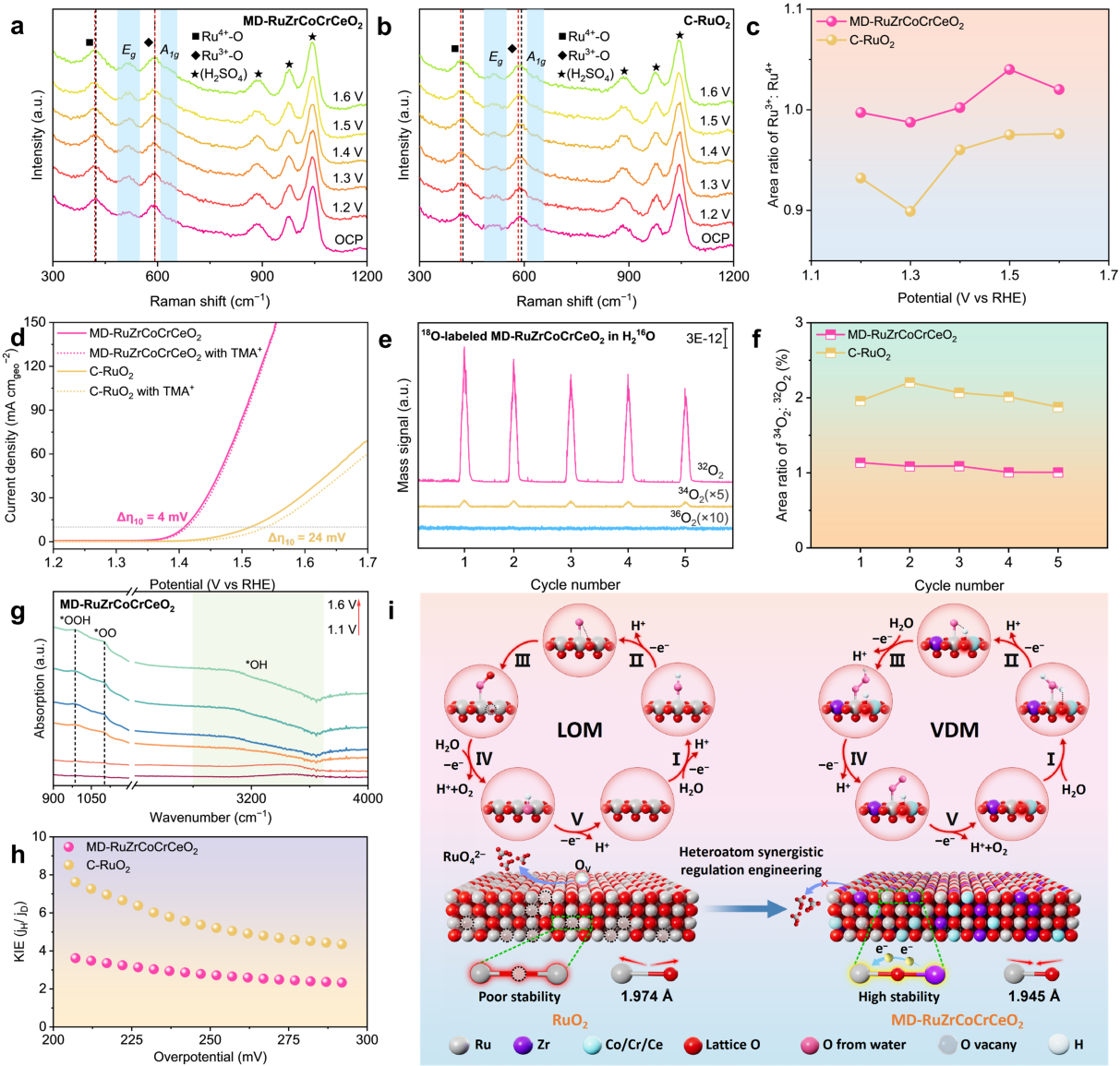 图4. 机理研究。a,b) 在0.5 M H2SO4中,MD-RuZrCoCrCeO2和C-RuO2从开路电位(OCP)到1.6 V(vs. RHE)连续改变电位下的原位拉曼光谱。黑色和红色虚线分别代表OCP和1.6 V(vs. RHE)下的Ru4+-O和Ru3+-O峰。c) (a,b)中Ru3+/Ru4+的峰面积强度比随外加电位的变化。d) MD-RuZrCoCrCeO2和C-RuO2在含有或不含0.1 M TMA⁺的0.5 M H2SO4电解质中的LSV曲线。e) MD-RuZrCoCrCeO2在0.5 M H2SO4/H218O电解质中18O同位素标记的O2的DEMS信号。f) MD-RuZrCoCrCeO2和C-RuO2的18O2/16O2质谱峰面积比。g) 在0.5 M H2SO4中,MD-RuZrCoCrCeO2从1.1到1.6 V(vs. RHE)连续改变电位下的原位ATR-SEIRAS谱图。h) 不同过电位下MD-RuZrCoCrCeO2和C-RuO2的KIE值。i) 分别展示在RuO2(LOM)和MD-RuZrCoCrCeO2(VDM)上的OER机理示意图。