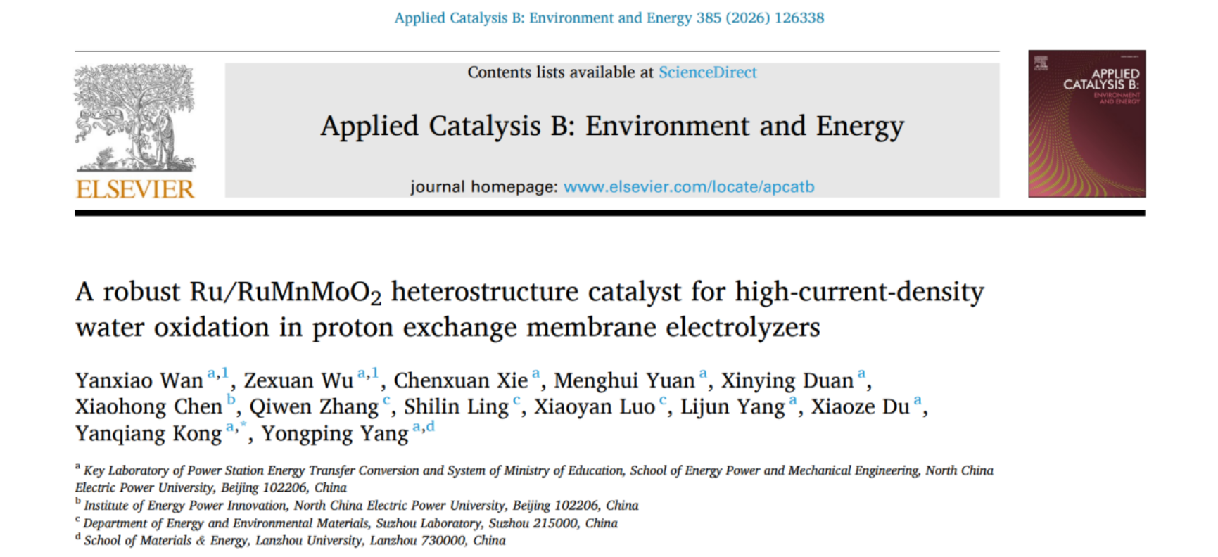 近日,华北电力大学孔艳强副教授在《Applied Catalysis B: Environment and Energy》期刊在线发表了题为“A robust Ru/RuMnMoO2 heterostructure catalyst for high-current-density water oxidation in proton exchange membrane electrolyzers”的研究论文,华北电力大学为论文第一完成单位,365英国上市官方网站硕士研究生万延笑、博士研究生吴泽轩为第一作者,孔艳强为通讯作者。该研究工作得到了国家自然科学基金的资助。